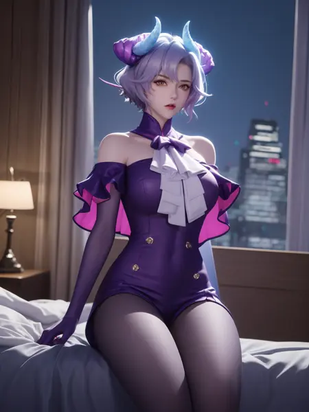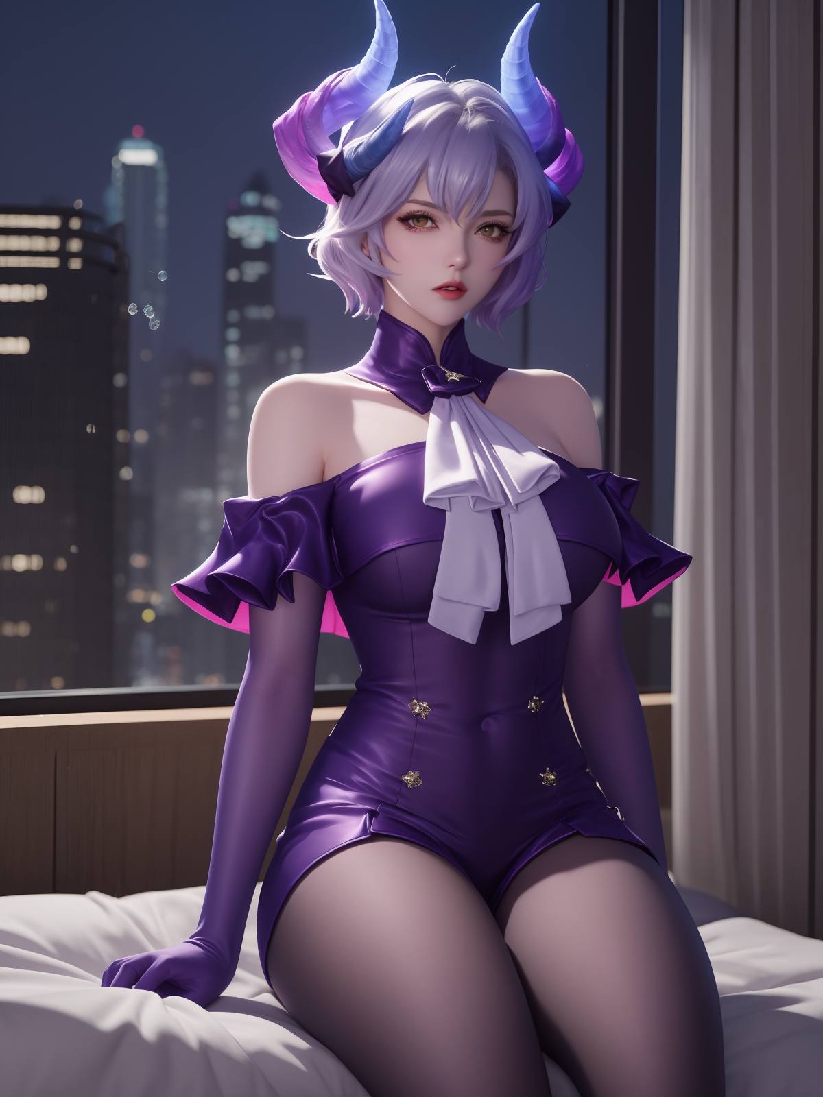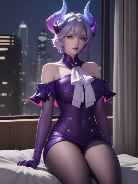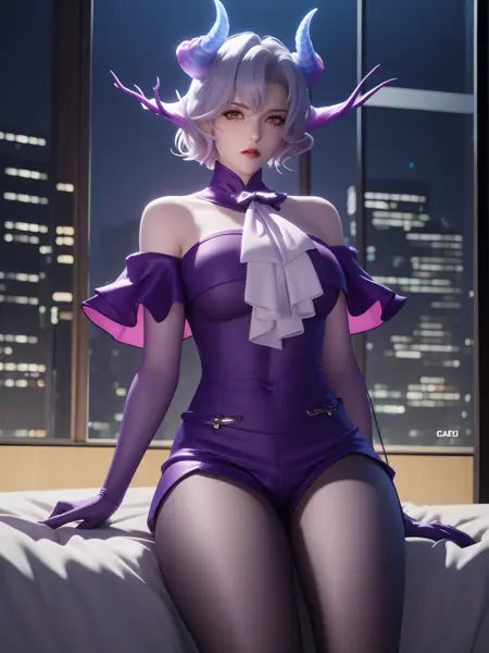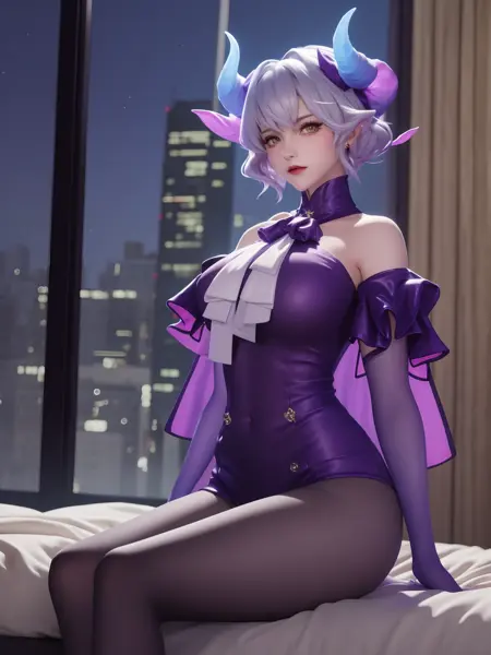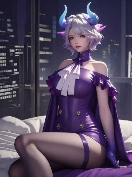 - WZRYmilaidiMFQY,1girl,solo,bare shoulders,horns,purple gloves,yellow eyes,short hair,looking at viewer,pantyhose,shorts,white ascot,mature female,cityscape,night,capelet,angry,sitting,bed,collar,