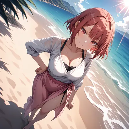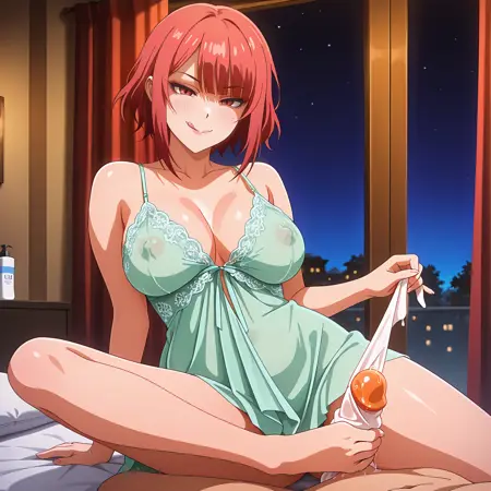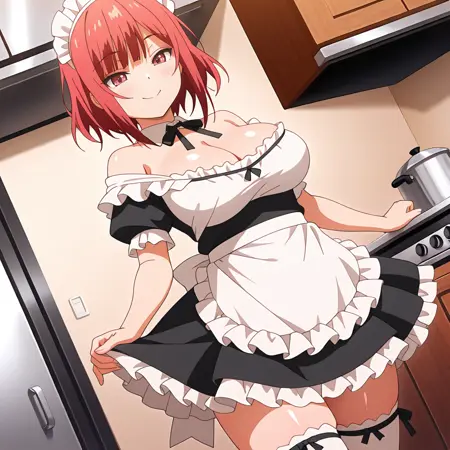 트리거: mitsko, 1girl, 단발, 빨간 머리, 곧은 앞머리, 빨간 눈, 흰 셔츠, 가슴 선, 팔꿈치보다 긴 소매, 긴 검은 연필 치마, 검은 팬티스타킹, 검은 하이힐