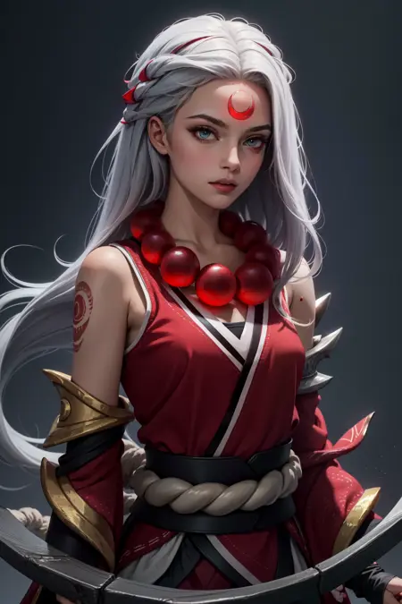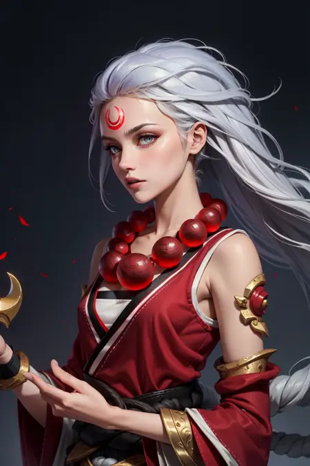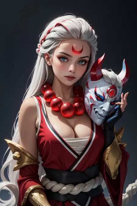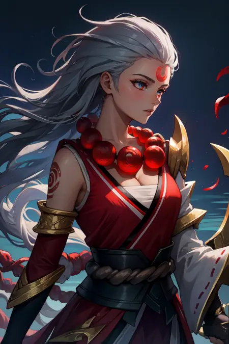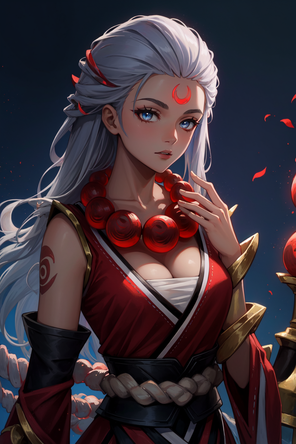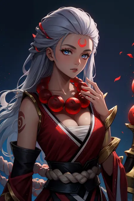 ブラッドムーン・ダイアナ:blood moon diana, 1girl, kimono, bead necklace, rope, detached sleeves, bare shoulders, cleavage, white hair