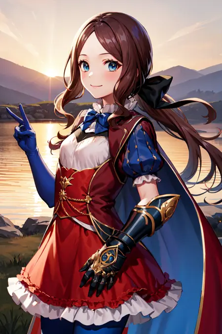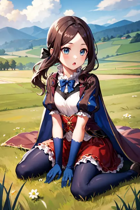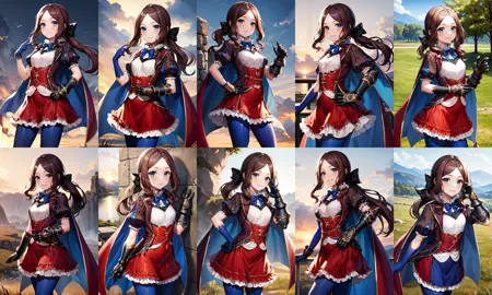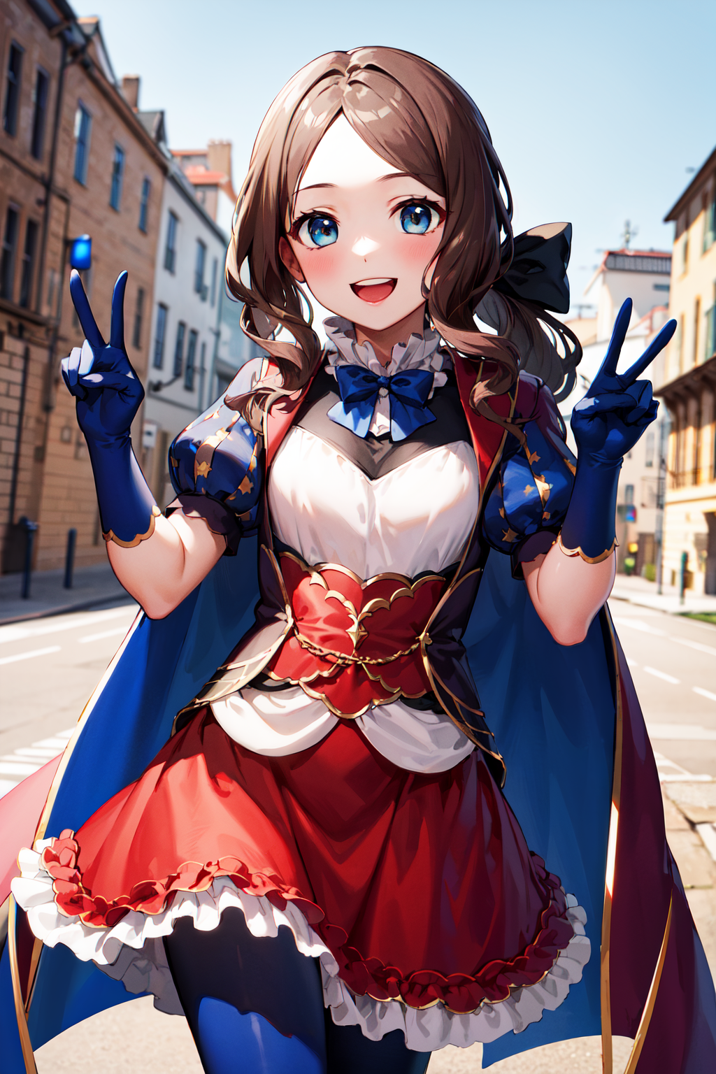 服装1(单只护腕 可移除)davinci, 马尾辫, 发带, 中分刘海, 小胸, 蓝色蝴蝶结, 斗篷, 蓬松短袖, 蓝色手套, 单只护腕, 红色短裙, 蓝色连裤袜