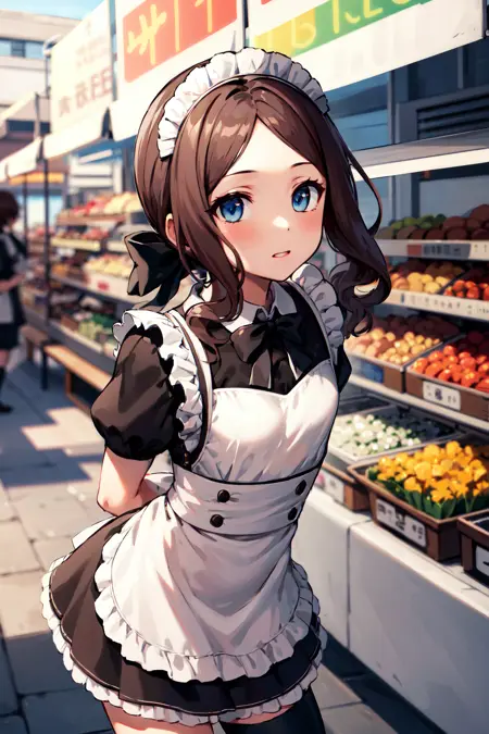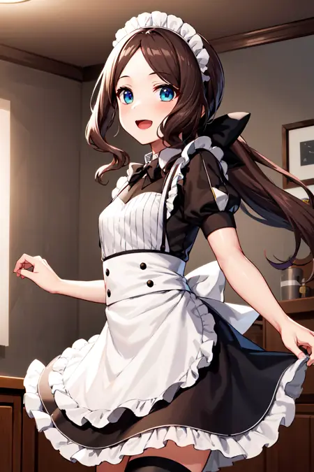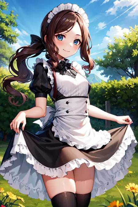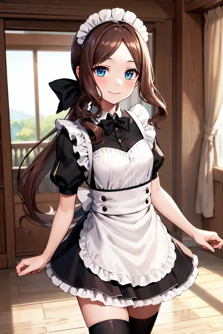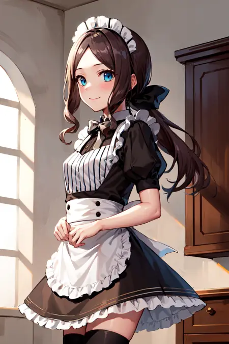 服装2davinci, 马尾辫, 发带, 中分刘海, 女仆头饰, 小胸, 女仆, 黑色连衣裙, 白色围裙, 蓬松短袖, 黑色过膝袜