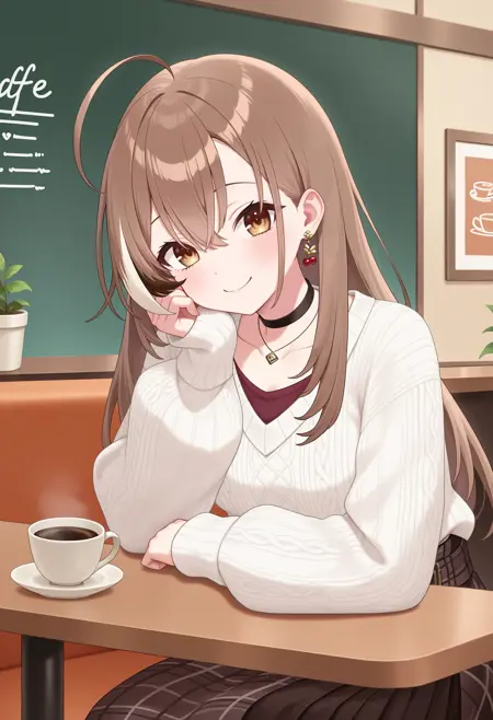 服装3-2(带毛衣)ccmumei, 长发, 条纹发, 棕发, 天线发, 耳环, 棕色眼睛, 黑色项圈, 项链, 白色毛衣, 长袖, 长裙, 格子裙, 棕色裙子