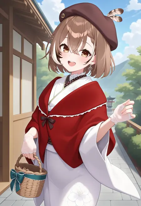服装2bbmumei, 短发, 条纹发, 棕发, 编发, 贝雷帽, 棕色头饰, 单耳环, 棕色眼睛, 红色披肩, 白色和服, 宽袖, 蕾丝手套, 白色手套, 露指手套