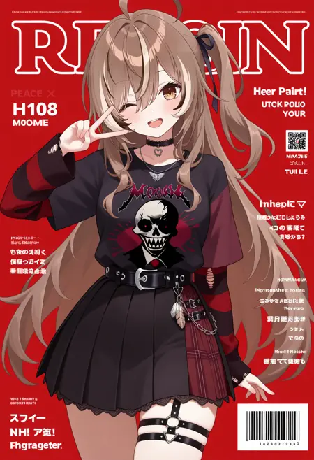 服装4-1(穿黑色衬衫,一侧高束)ddmumei, 长发, 条纹发, 棕发, 一侧高束, 发带, 天线发, 棕色眼睛, 黑色项圈, 项链, 破损衣物, 印花衬衫, 黑色衬衫, 条纹毛衣, 红色毛衣, 短袖叠长袖, 黑色腰带, 外裙, 百褶裙, 黑色裙子, 大腿绑带