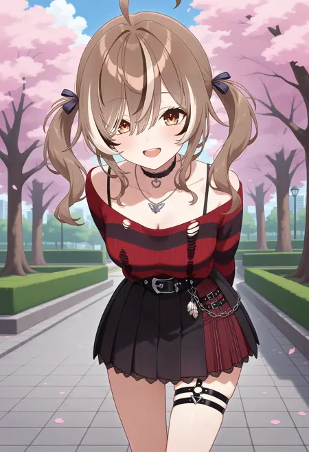 服装4-2(无黑色衬衫,双马尾)ddmumei, 条纹发, 棕发, 双马尾, 发带, 天线发, 棕色眼睛, 黑色项圈, 项链, 露肩, 破损衣物, 条纹毛衣, 红色毛衣, 长袖, 黑色腰带, 外裙, 百褶裙, 黑色裙子, 大腿绑带