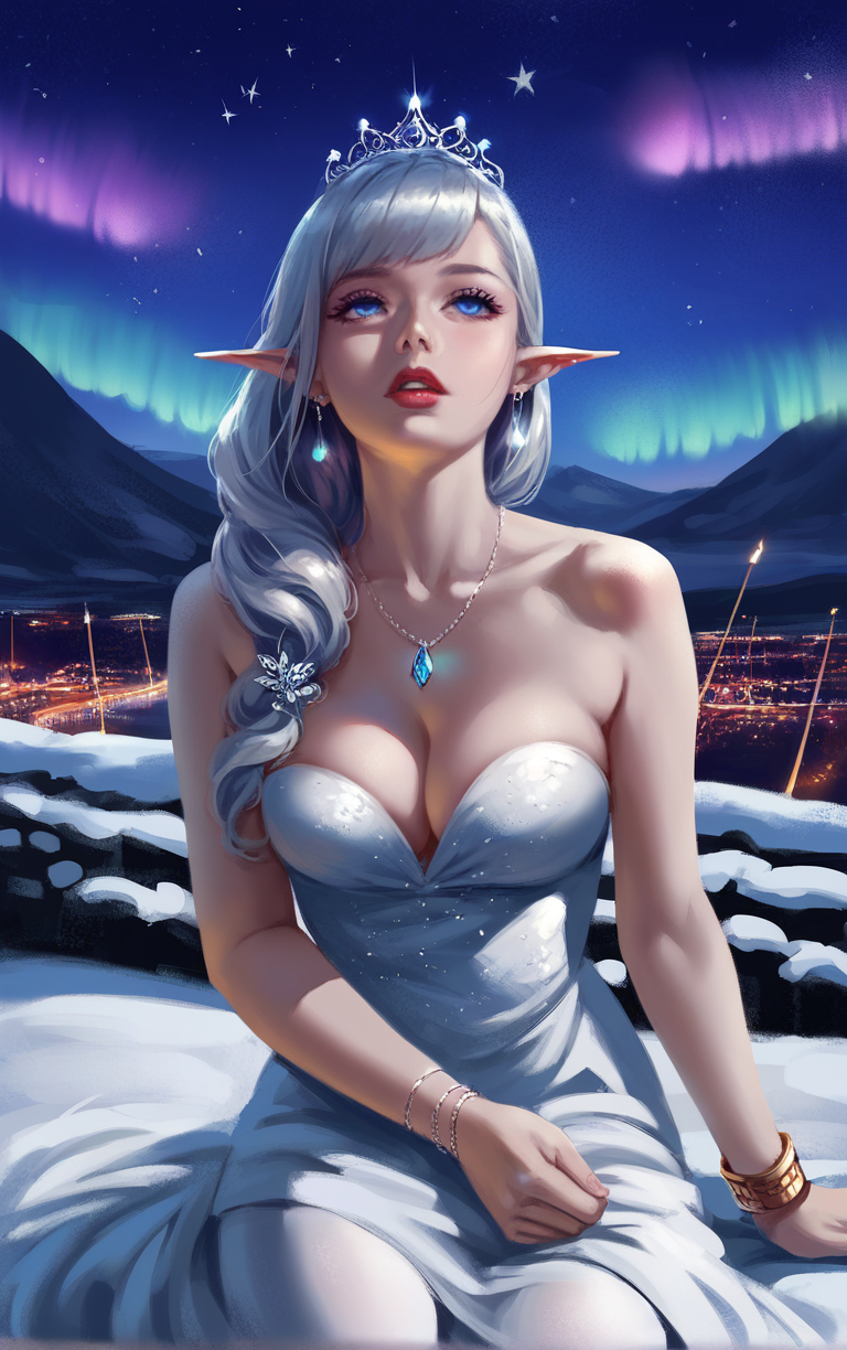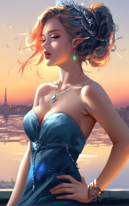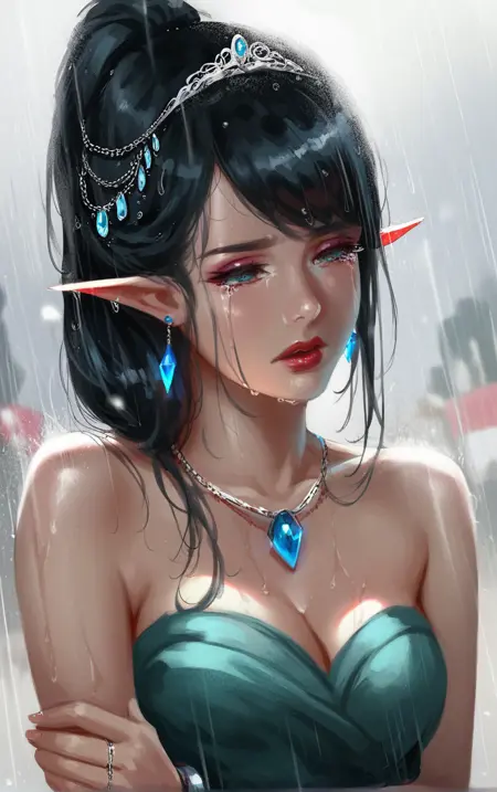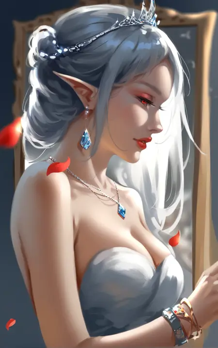 1girl, long hair, jewelry,  bare shoulders, lips, pointy ears, necklace, earrings,