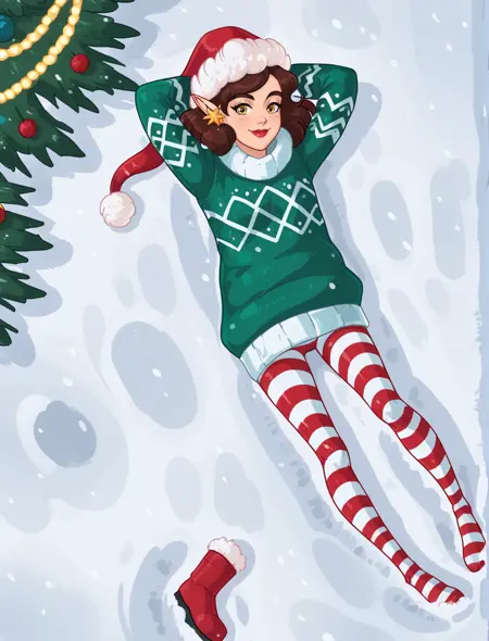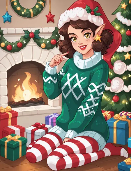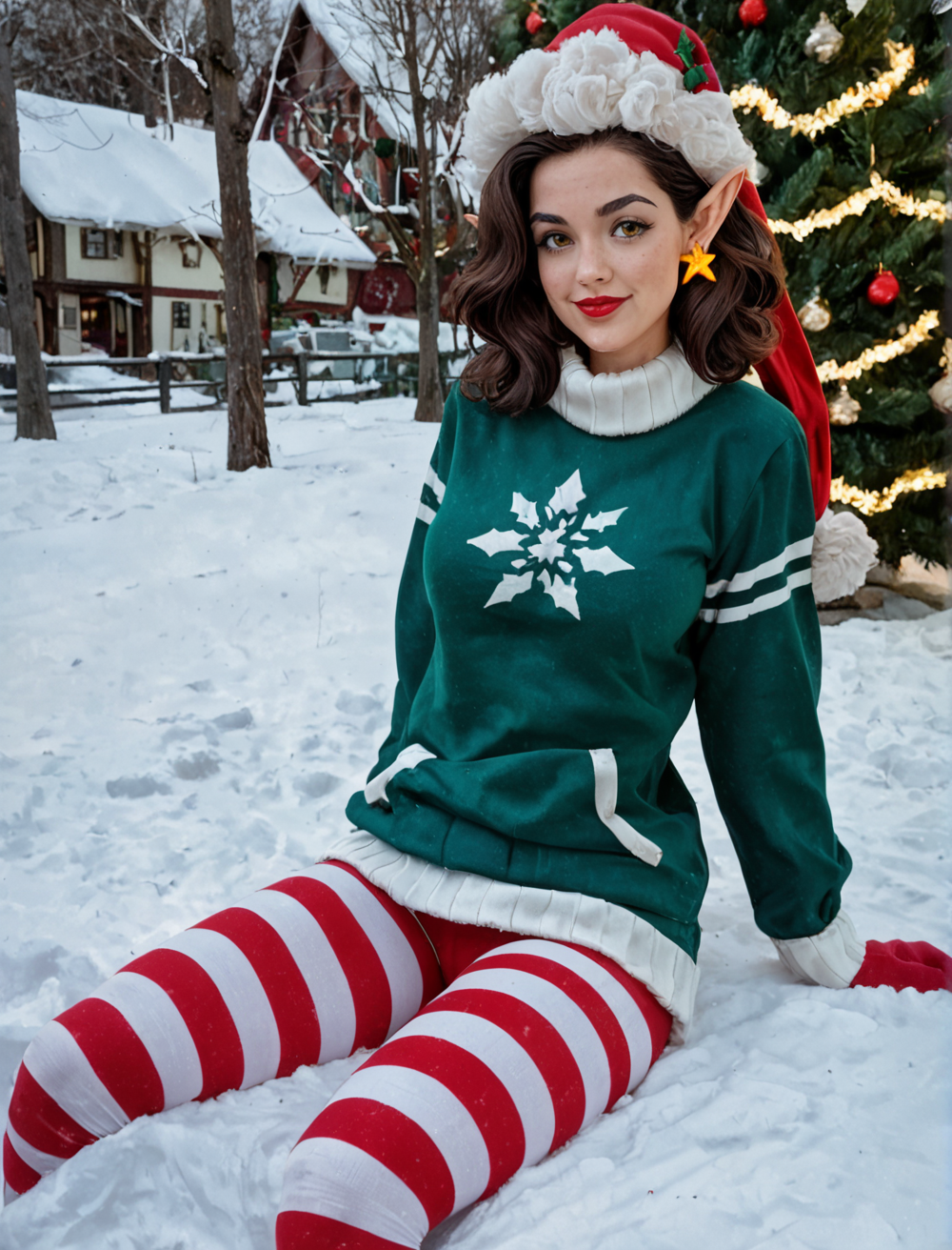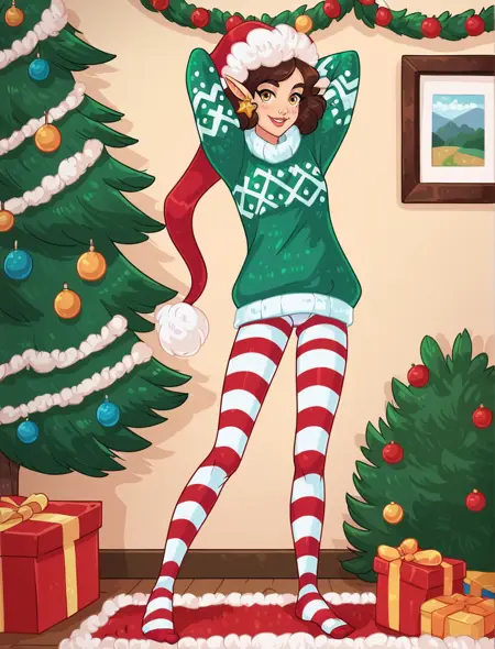 green sweater, striped pantyhose, santa hat, star earrings