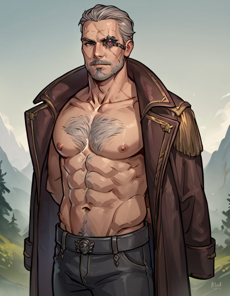 "1boy, solo, old man, abelard, facial hair, scar on face, monocle, grey hair, coat, coat over shoulders, uniform, breastplate"