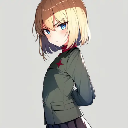 katyusha, blonde hair, blue eyes, bob cut, flat chest, pravda school uniform