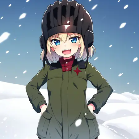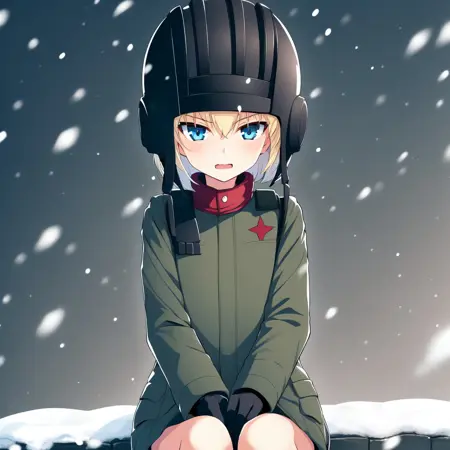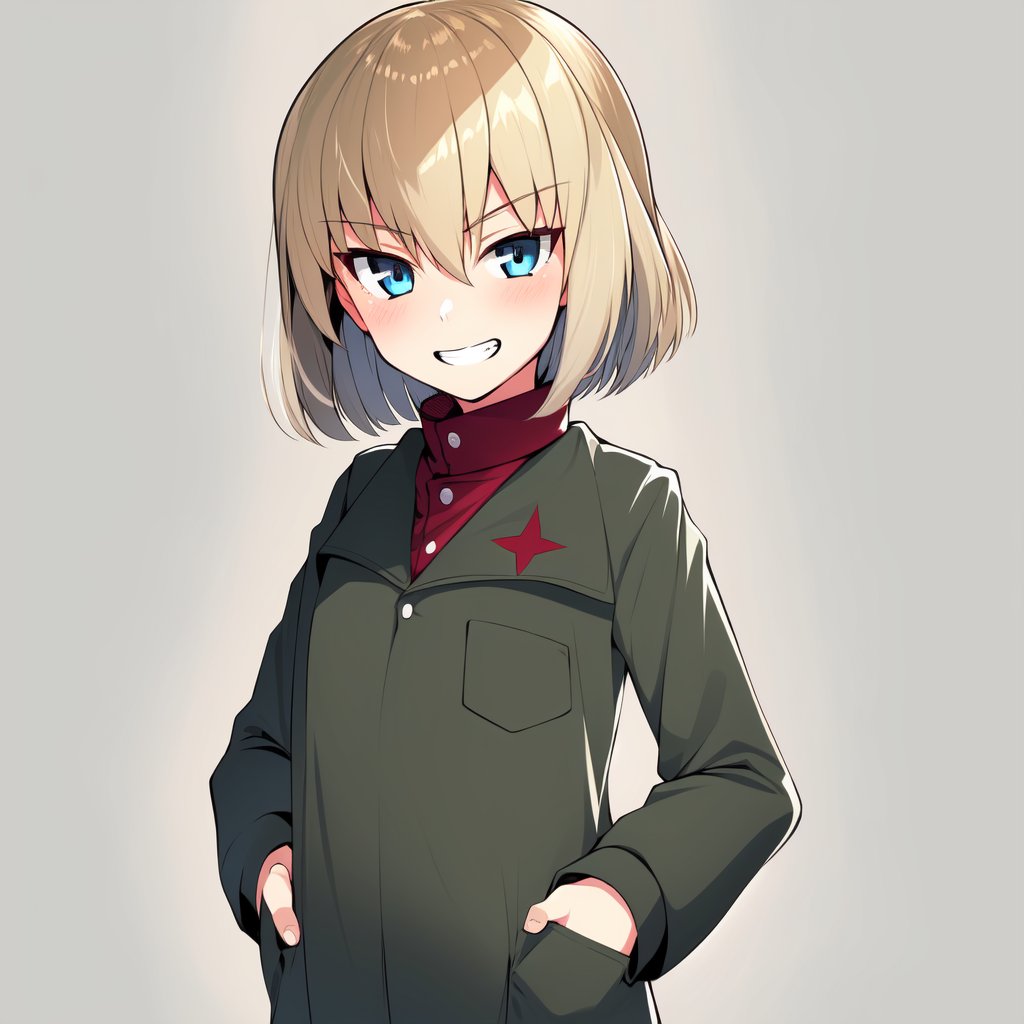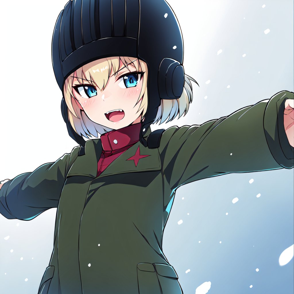 katyusha, blonde hair, blue eyes, bob cut, flat chest, pravda school uniform, helmet