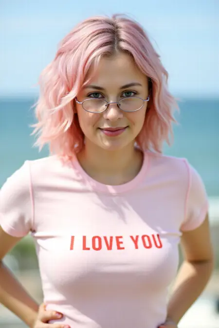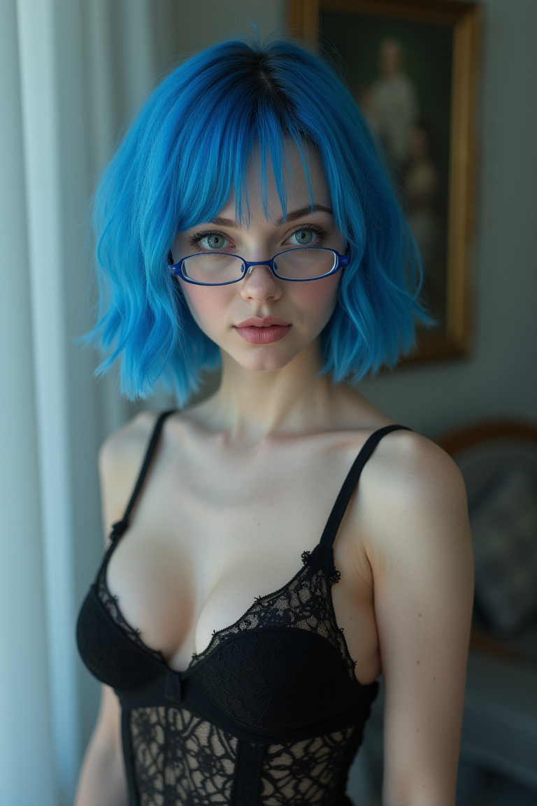 With my LoRAs for the small wire-frame glasses you have a chance that Flux already makes this pose from its own, but here is also a LoRA to get it reliably: a woman "looking seductively over her glasses" which is also the keyphrase I used for the training. The strength varies wildly. You don't expect it, but it is easier with small glasses like in reality. If you use it with the small glasses LoRAs, you can go as low as 0.5 without anything else. With the big vanilla Flux glasses, you may need 1.0 and a additional lora:LookingOverGlasses-30:1 tag. But so far, it looks like you can retain the shape from the first LoRA and add only the pose if you get the strength right.