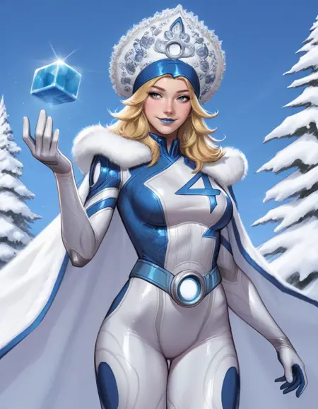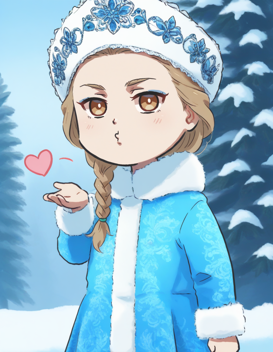 次触发词:斯拉夫女孩、金发、蓝眼睛、科科什尼克头饰、蓝色外套、白色毛皮镶边、衣服上的华丽刺绣、云杉、雪