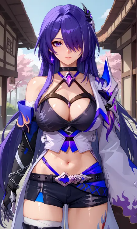 검은 벨트, 검은 목걸이, 검은 장갑, 검은 반바지, 팔에 감긴 체인, 코트, 십자형 헬터, 분리된 소매, 헬터넥, 가슴 노출, 보석, 복부 노출, 어깨 갑옷, 한쪽 어깨 노출, 한쪽 분리된 소매, 비대칭 옷, 흰 코트, 검은 신발, 한쪽 허벅지 부츠, 비대칭 신발, 허벅지 문신