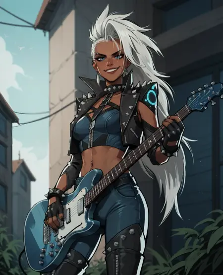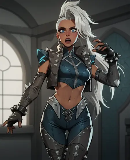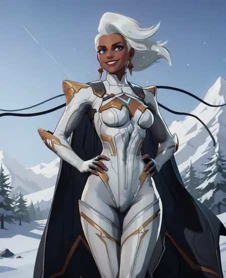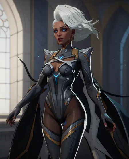 Appearance: St0rm, 1girl, dark-skinned female, white hair, blue eyes