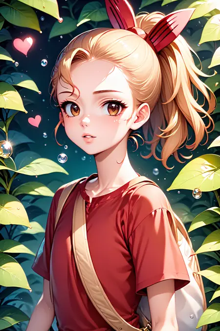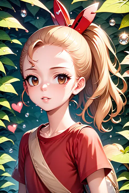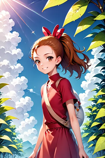 arriety, 1girl, solo, 갈색 머리카락, 꼬리머리, 가방, 갈색 눈, 드레스, 긴 머리, 빨간 드레스,