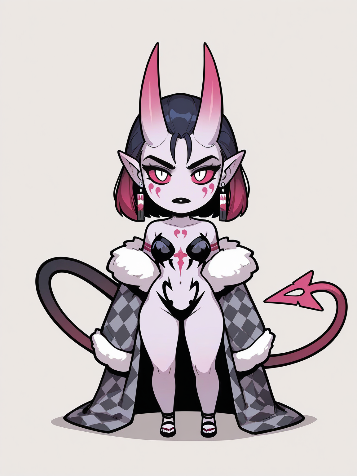 derpherzha,恶魔女孩,恶魔尾巴,彩色皮肤,彩色巩膜,面部纹饰,鬼角,短发,黑唇,渐变发色,纹身