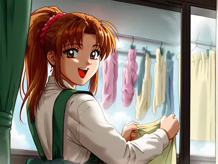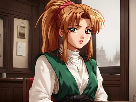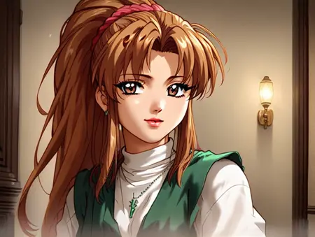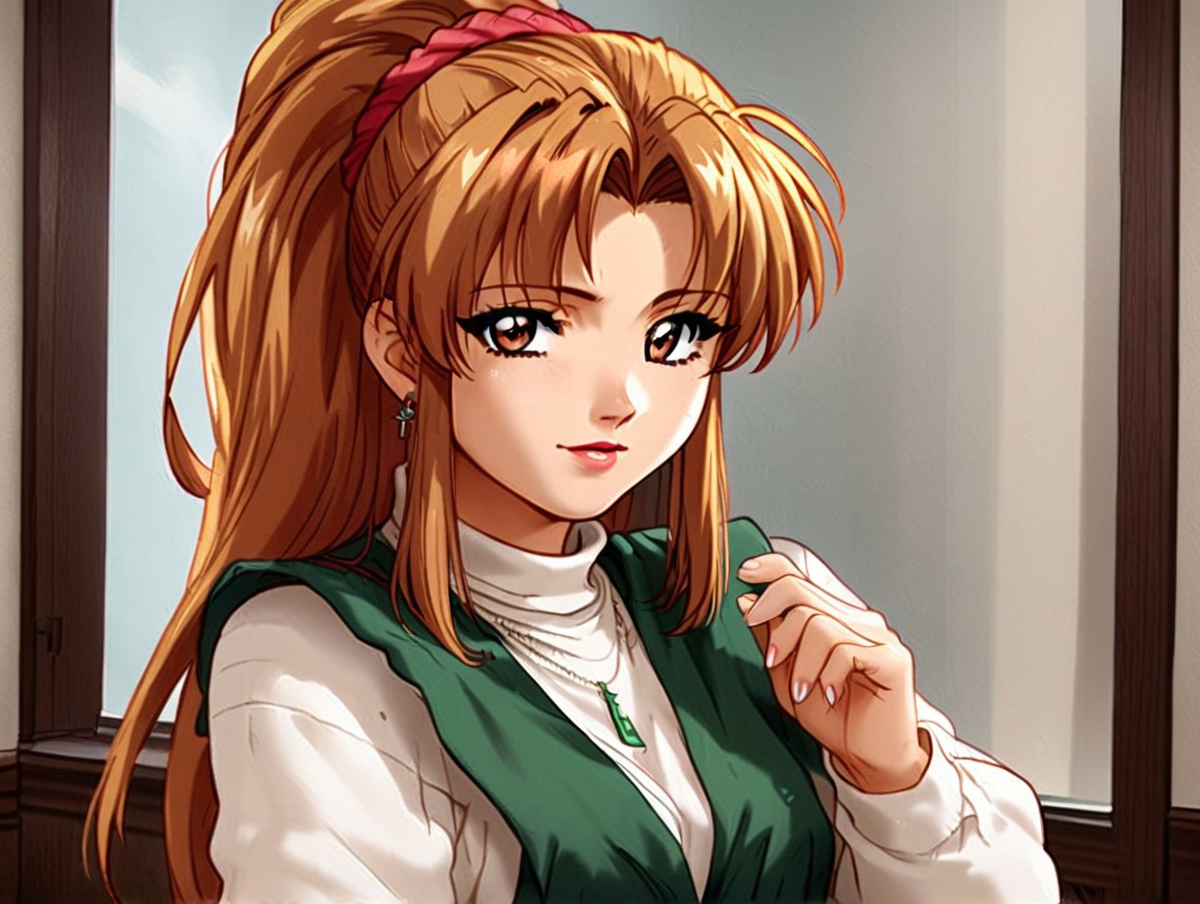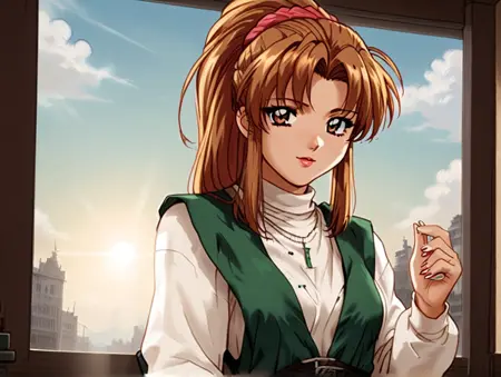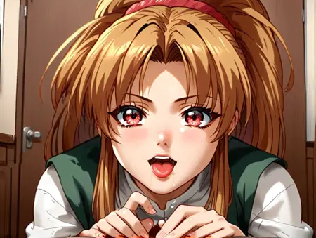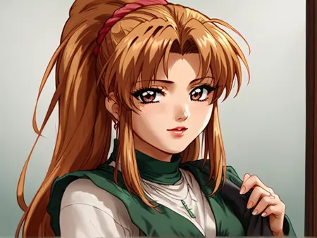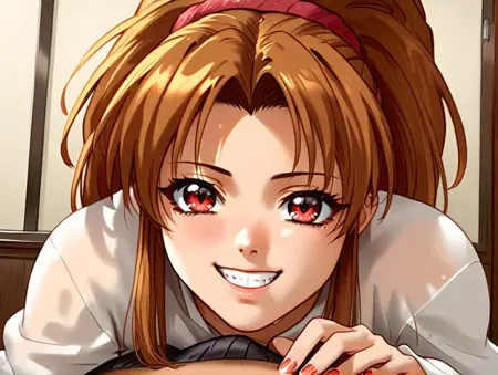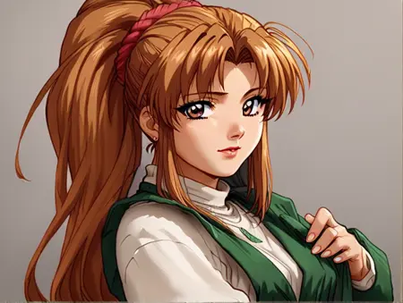 r4n4, 1girl,solo, looking at viewer, brown hair, red eyes, ponytail,