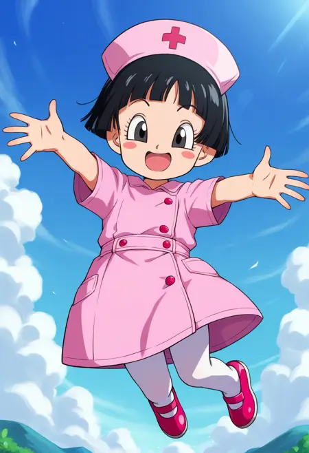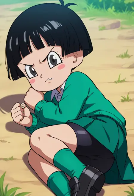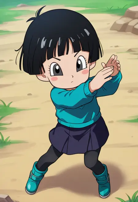 キャラクタープロンプト: pan \(dragon ball\), 子供, ボウルカット, 黒い目, チークステッカー, 非常に短い髪, まっすぐな前髪, 黒髪