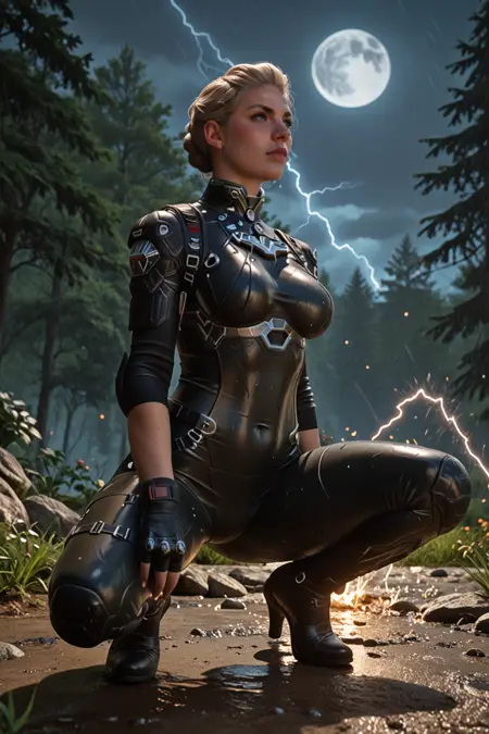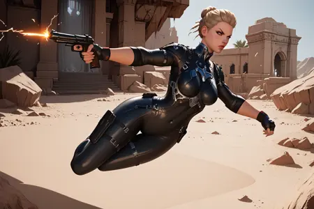 トリガー:inesraya、短い髪、髪の結び目、編み込み、ボディスーツ、肌にぴったりフィット、へそが隠れている、指なし手袋、太ももハーネス、ハイヒール