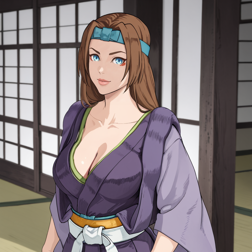 - 化妆伪装触发词:SelinaKyleBatmanNinja, 1girl, large breasts, long hair, blue eyes, chain, headband, cleavage, japanese clothes, brown hair, cowboy shot