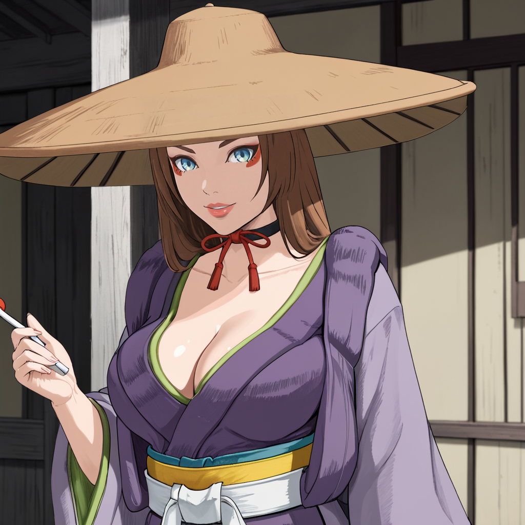 - 戴帽子触发词:SelinaKyleBatmanNinja, 1girl, large breasts, hat, cleavage, blue eyes, long hair, brown hair, japanese clothes, makeup, choker, cowboy shot