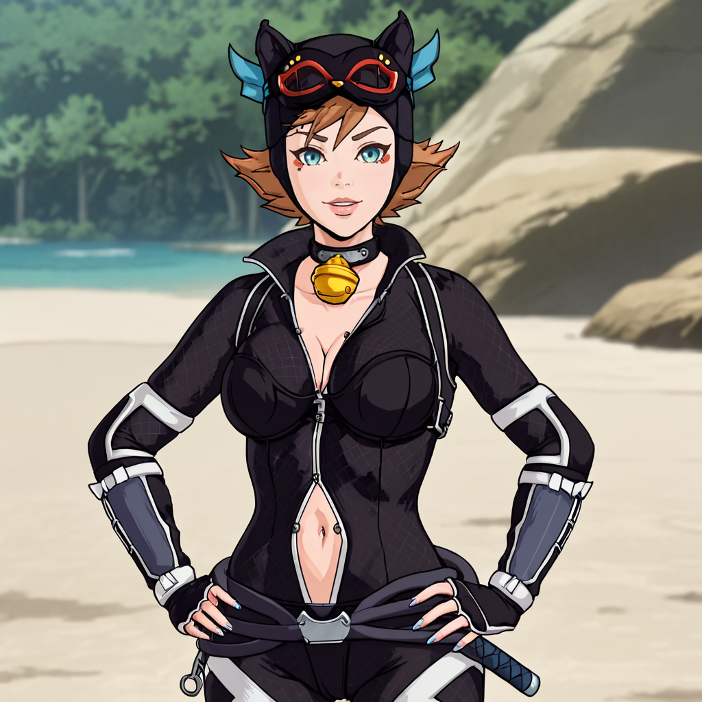 - 无面具触发词:CatwomanWithoutMaskBatmanNinja, 1girl, short hair, navel, breasts, brown hair, bodysuit, goggles on head, blue eyes, neck bell, hat, animal ears, gloves, cowboy shot
