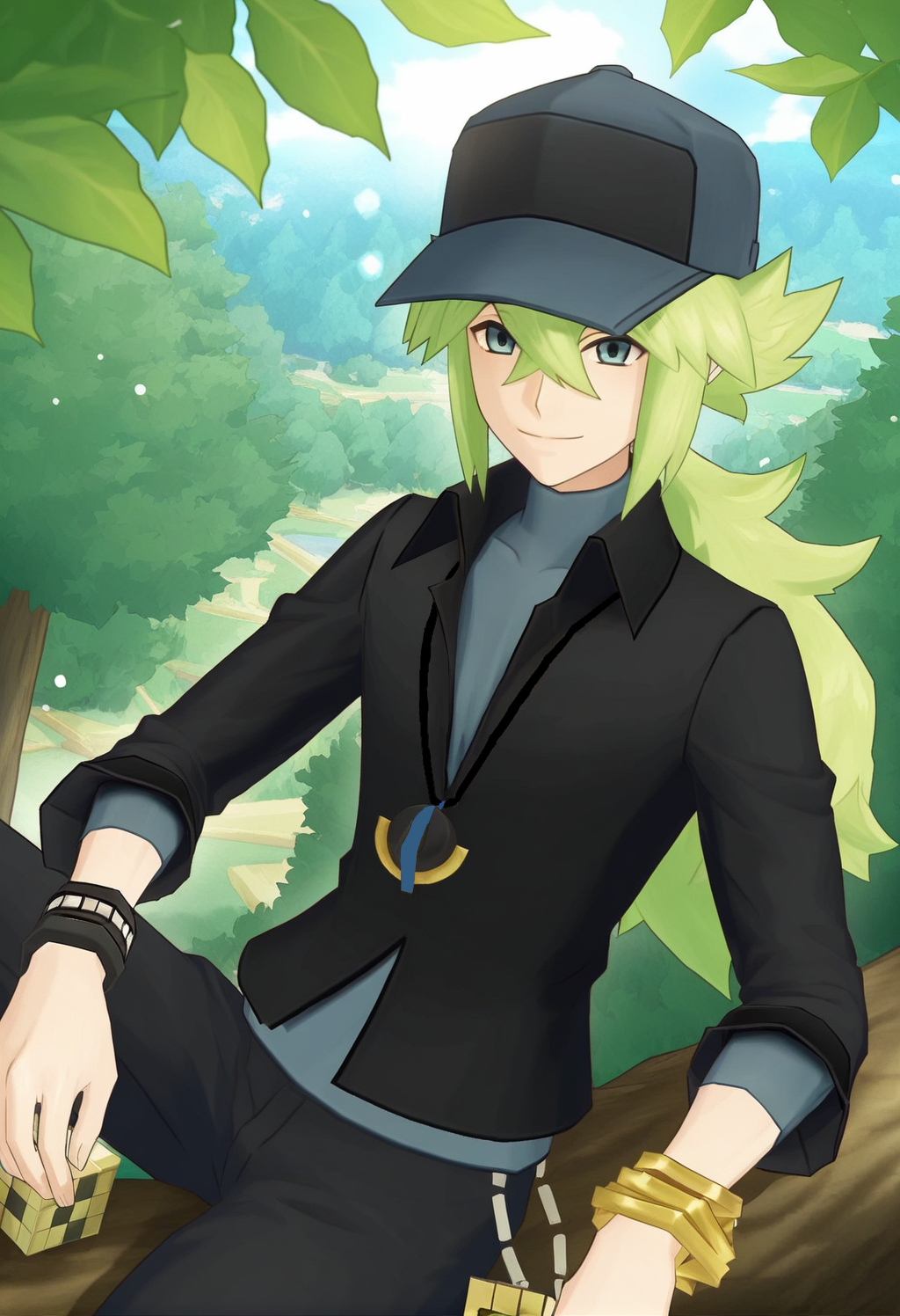 natural harmonia black, 1boy, green hair, male focus, long hair, solo, blue eyes, bangs, ponytail, hair between eyes, n blue black hat, baseball cap, n blue black shirt, n black overshirt, n blue shoes, n black pants, n blue undershirt, n jewelry, n silver studded black right bracelet, cube hanging off of pants by a silver chain, n silver cube chain, n gold black cube, n three squares gold left bangle, different bracelets, two bracelets, n blue black gold planet sphere necklace, collared shirt, smile, closed mouth, holding, open mouth, looking at viewer, poke ball, poke ball (basic), holding poke ball, pokemon (creature), standing, hand up, day, full body, from behind, upper body, from below, water, stadium, long sleeves, outdoors, solo focus, from side, hair over one eye, hand on hat, clenched hands, multiple boys, night, traditional media, weapon, gun, sparkle, closed eyes, crowd, card,