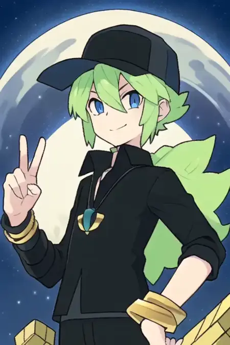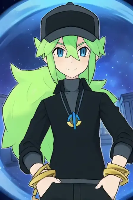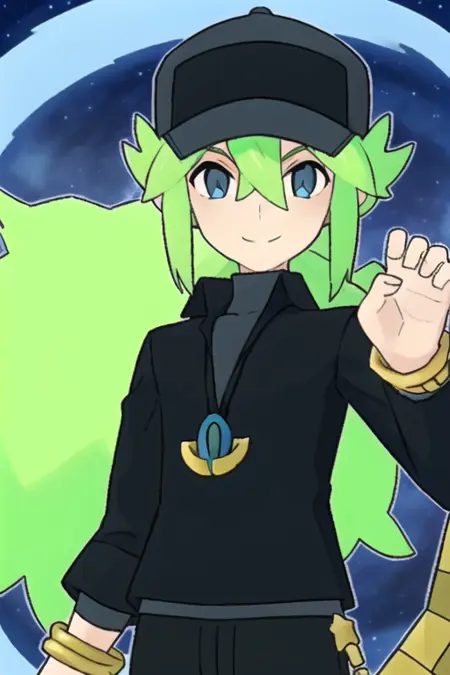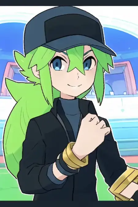natural harmonia black, 1boy, green hair, male focus, long hair, solo, blue eyes, bangs, ponytail, hair between eyes, n blue black hat, baseball cap, n blue black shirt, n black overshirt, n blue shoes, n black pants, n blue undershirt, n jewelry, n silver studded black right bracelet, cube hanging off of pants by a silver chain, n silver cube chain, n gold black cube, n three squares gold left bangle, different bracelets, two bracelets, n blue black gold planet sphere necklace, collared shirt, smile, closed mouth, holding, open mouth, looking at viewer, poke ball, poke ball (basic), holding poke ball, pokemon (creature), standing, hand up, day, full body, from behind, upper body, from below, water, stadium, long sleeves, outdoors, solo focus, from side, hair over one eye, hand on hat, clenched hands, multiple boys, night, traditional media, weapon, gun, sparkle, closed eyes, crowd, card,