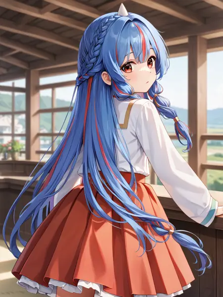 eunha, 1girl, solo, 긴 머리, 치마, 빨간 눈, 긴 소매, 매우 긴 머리, 파란 머리, 땋은 머리, 뿔, 줄무늬 머리, 빨간 치마