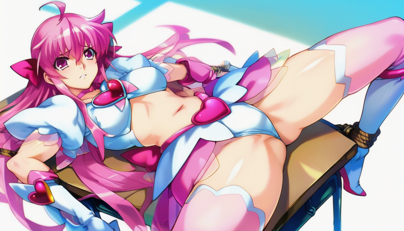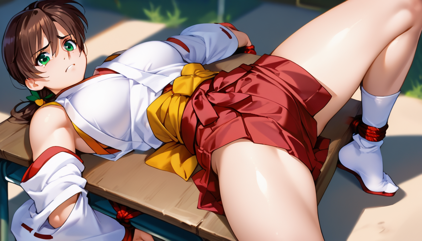1girl , bound_to_desk, lying, on back, on desk, open shoulder, bound wrists, red ropes with legs to desk legs, spread legs,