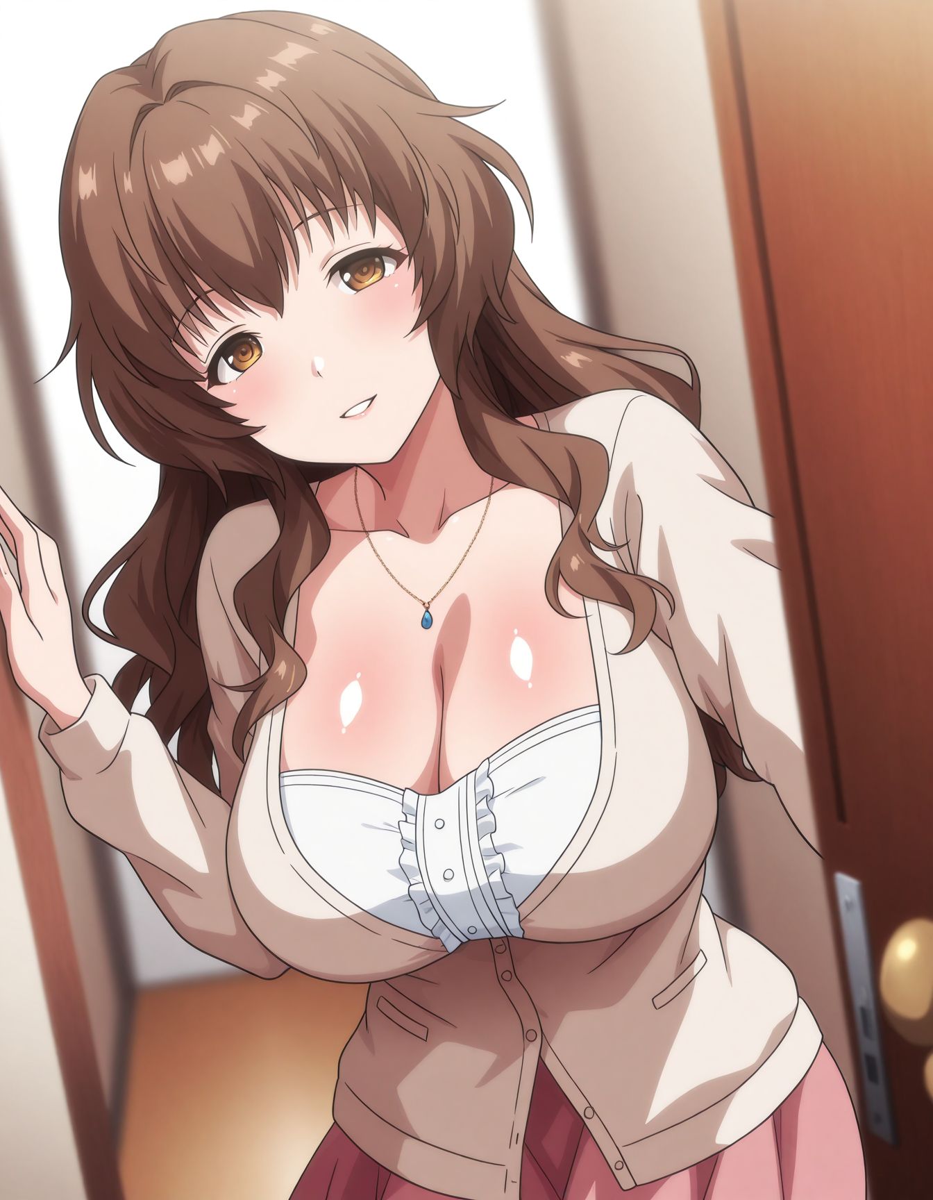 복장2: 카디건, 중앙 프릴, 분홍 치마