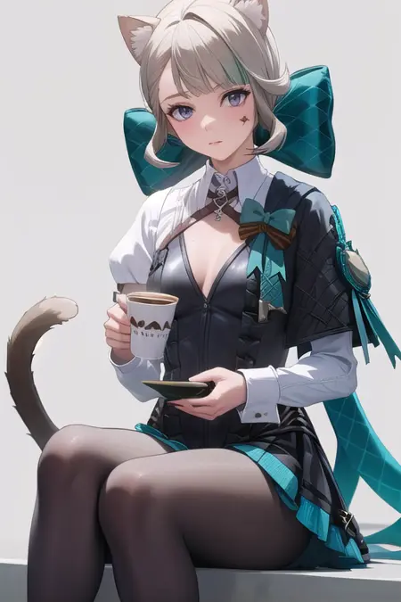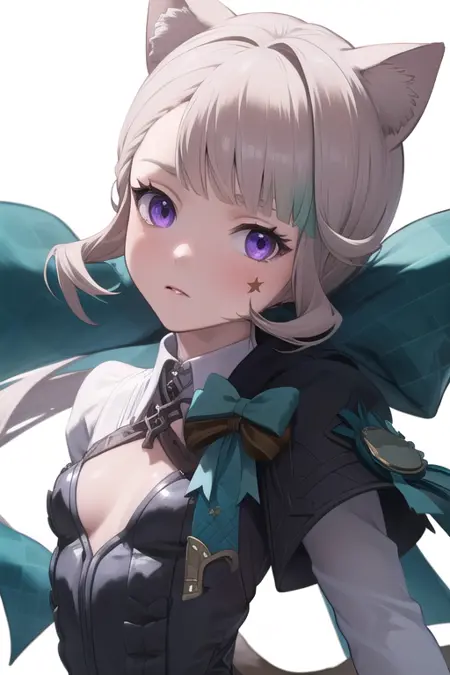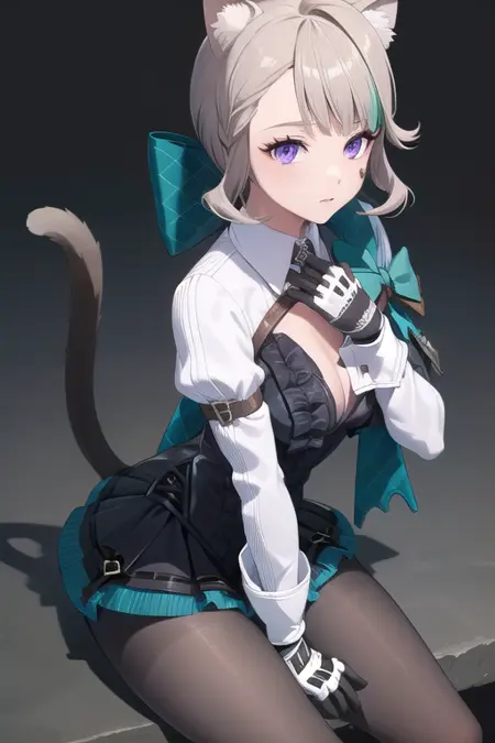 cat ears, purple eyes, bow, low ponytail, gloves, cutout, pantyhose, cat tail, plaid ribbon