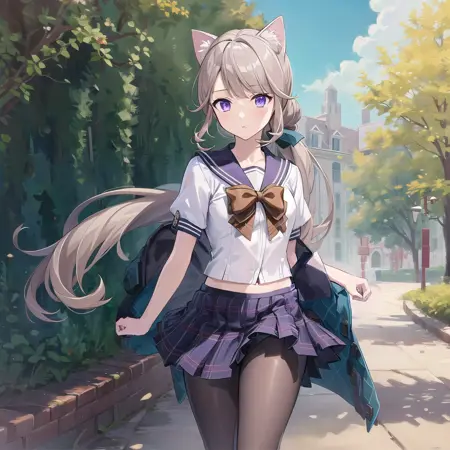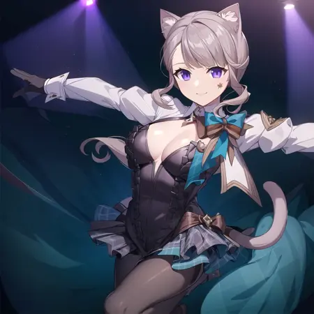 cat ears, purple eyes, bow, low ponytail, gloves, cutout, pantyhose, cat tail, plaid ribbon