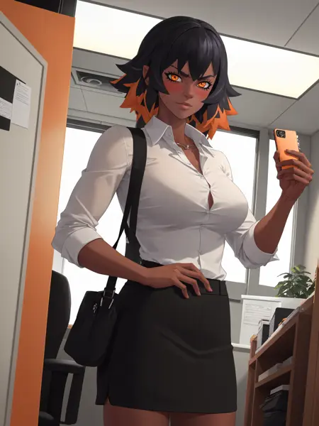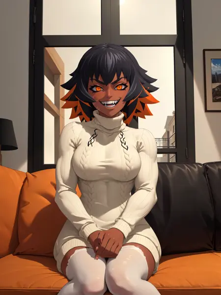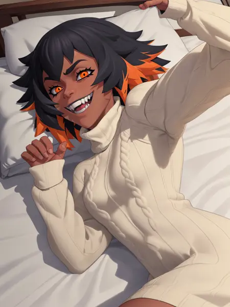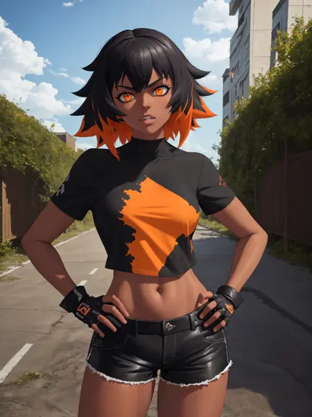 "슬릿 동공, 검은 피부의 여성, 검은 머리, 주황색 내부 머리카락, 주황색 눈"은 때때로 제대로 작동하지 않는 디자인 요소를 고정하는 데 도움이 됩니다. 내부 머리카락 색상은 여전히 약간 랜덤하게 생성될 수 있습니다.