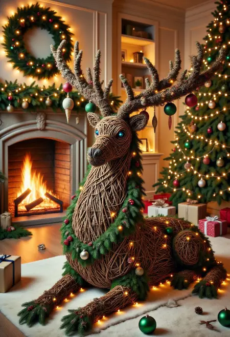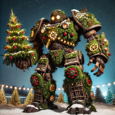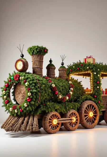 ホリデーの精神が形となる世界へようこそ。Christmas Creations LoRA。このモデルは、日常の物体、ファンタジーな生き物、象徴的なデザインを、すべてクリスマスツリーの枝、松の葉、装飾品、輝くガーランドで作られた繊細な作品に変換します。ユーモラスな飛行機から神話のドラゴン、居心地の良い暖炉まで、このLoRAは、祝祭的で想像力豊かなシーンを生み出すための鍵です。