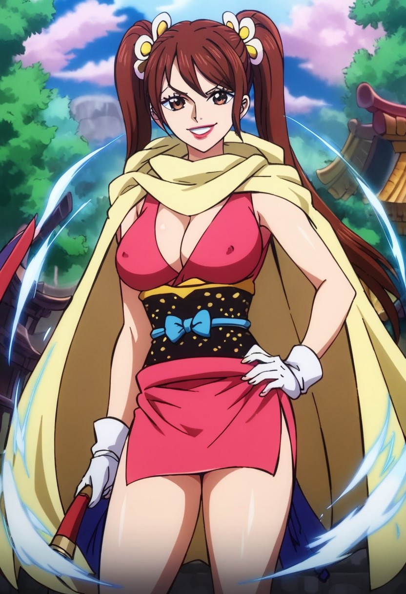 ShinobuOP, 1girl, solo, brown hair, brown eyes, long hair, twin ponytails, long ponytails, makeup, lips, lipstick, cleavage, large breast, japanese clothes, light-yellow scarf, hot-pink short dress, plunging neckline, short sleeveless kimono, flower patterns, checkered obi, high-heeled sandals, knee-length cape, hair ornament, white gloves, katana,