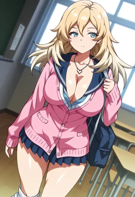 • 복장: school uniform, sailor collar, shirt, cardigan, pink cardigan, skirt, miniskirt, blue skirt, pleated skirt, socks, loose socks, white socks, necklace, heart necklace, jewelry, cleavage