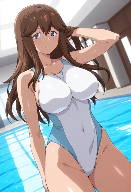 • 복장: swimsuit, one-piece swimsuit, white one-piece swimsuit, competition swimsuit, highleg swimsuit, highleg