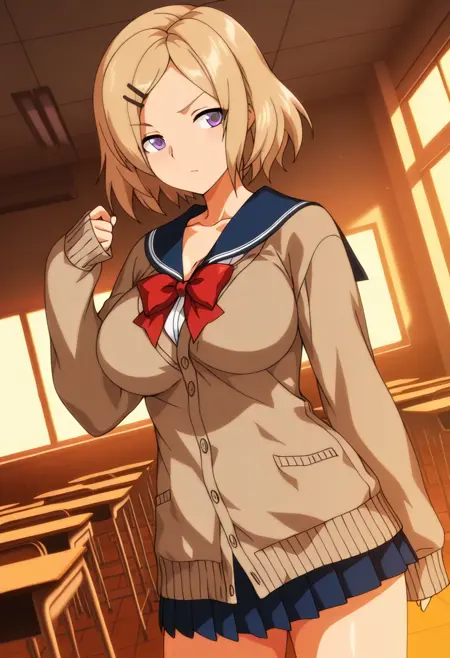 Sayuki: 1girl, sayuki, breasts, large breasts, blonde hair, purple eyes, short hair, hairclip, hair ornament
