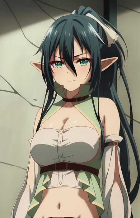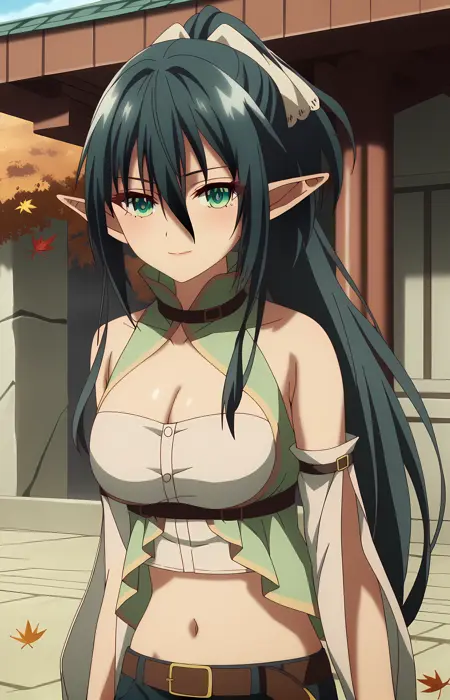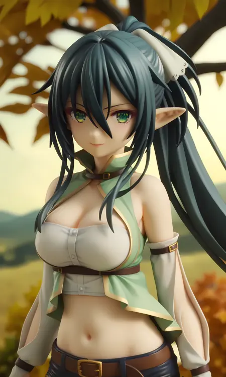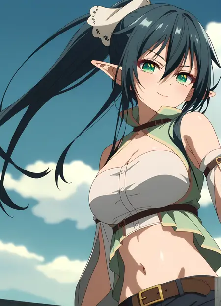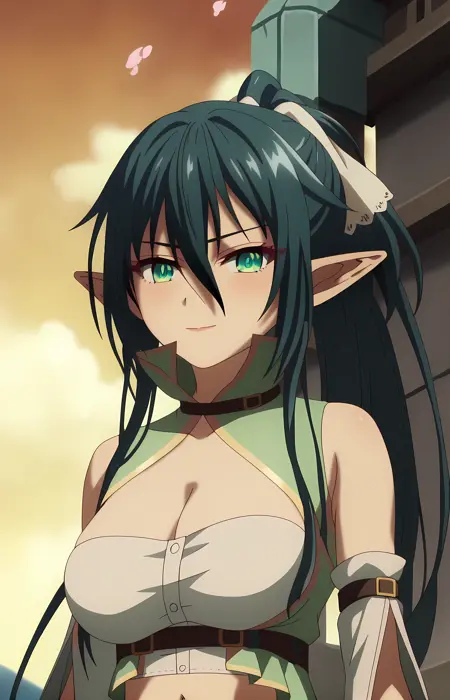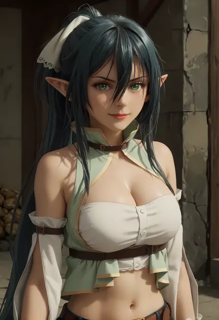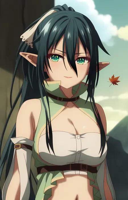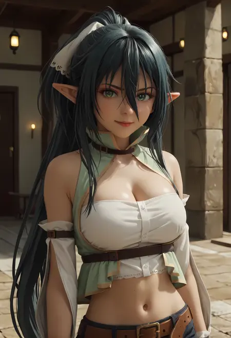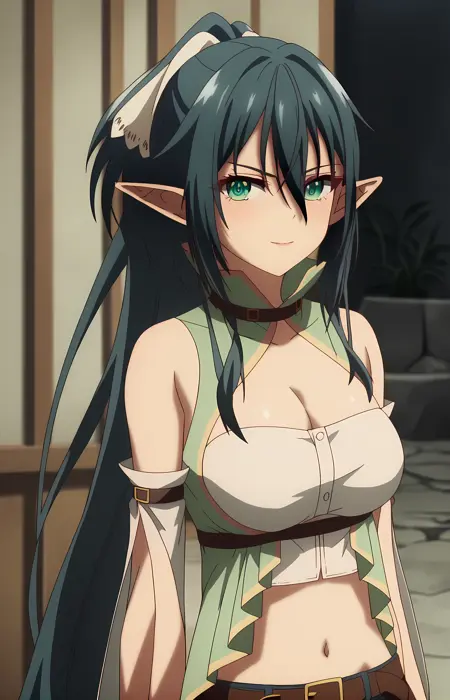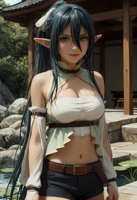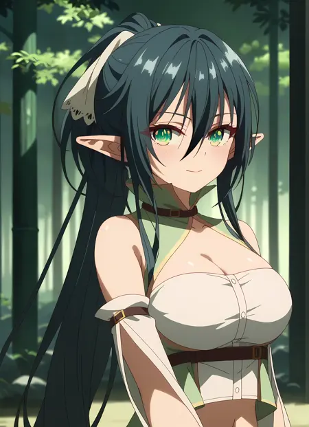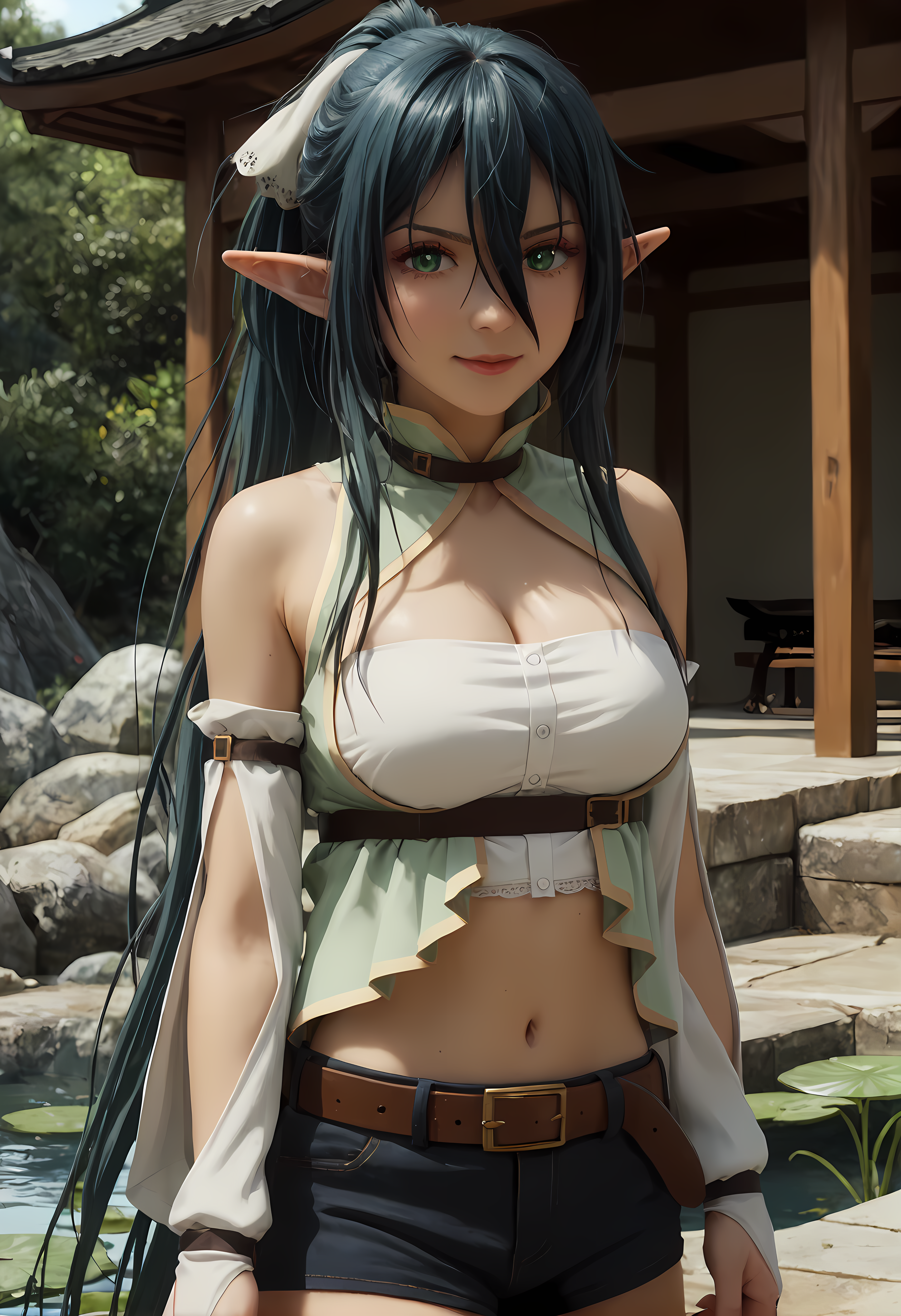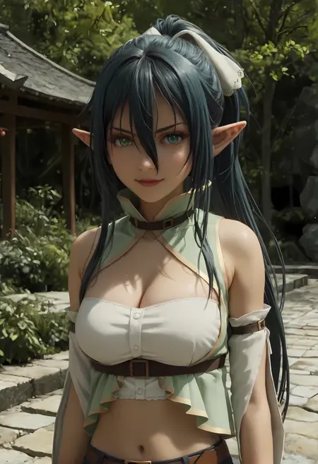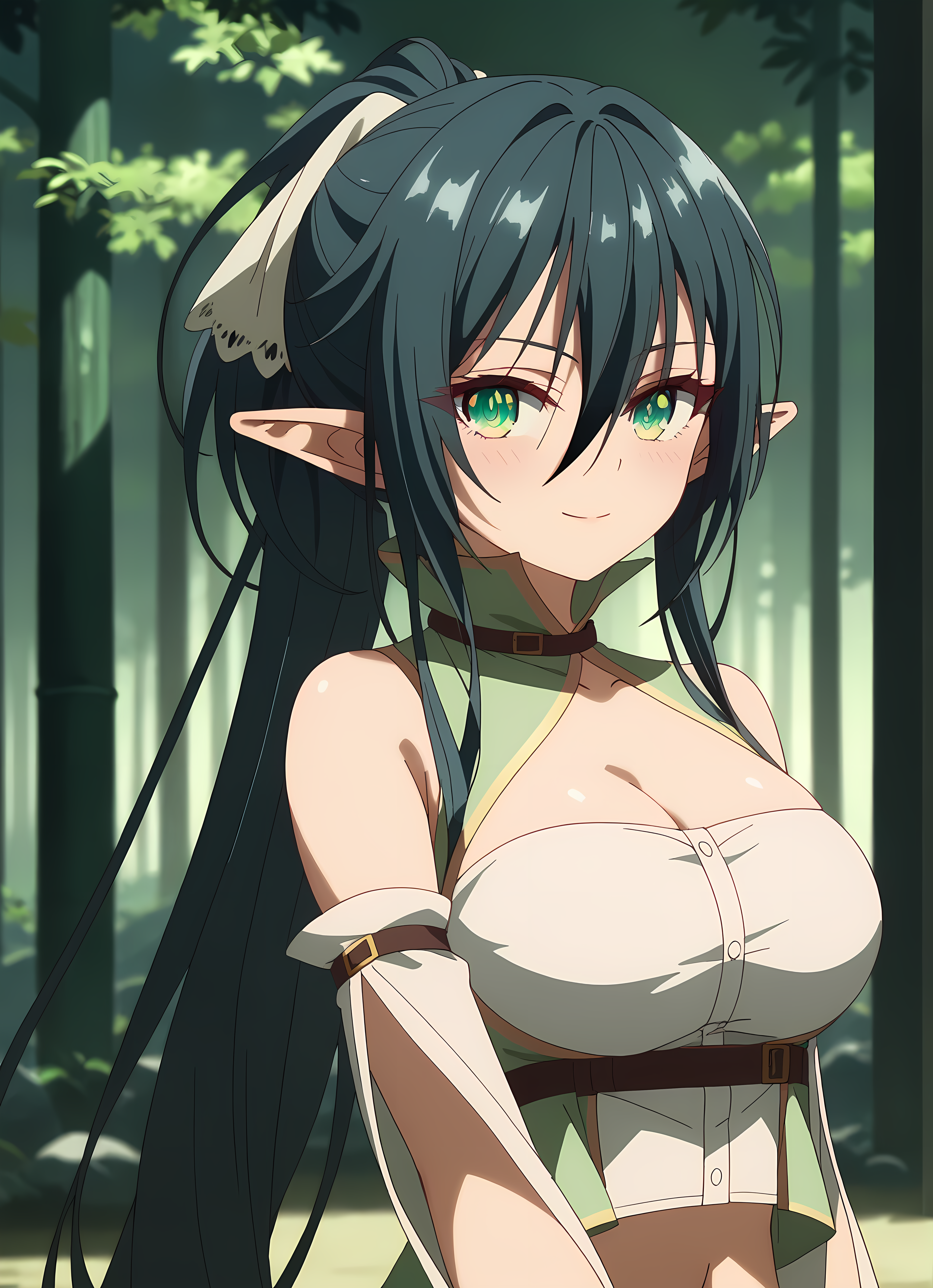 외형 → ohwx, 1girl, long_hair, green_eyes, solo, pointy_ears, ponytail, elf, breasts, hair_between_eyes, black_hair, green_hair, cleavage, very_long_hair, thighhighs, medium_breasts, large_breasts, black_thighhighs, blue_hair,