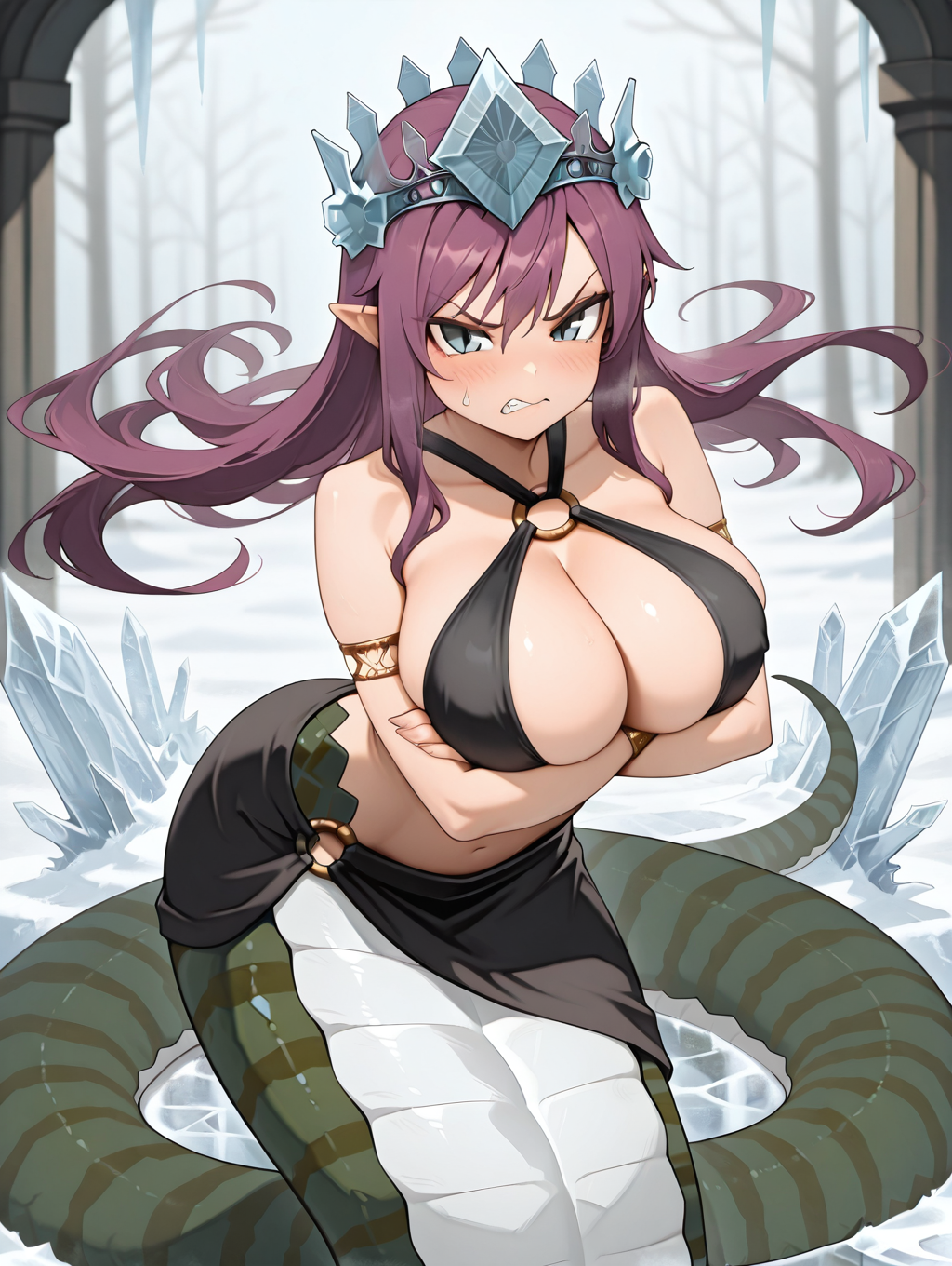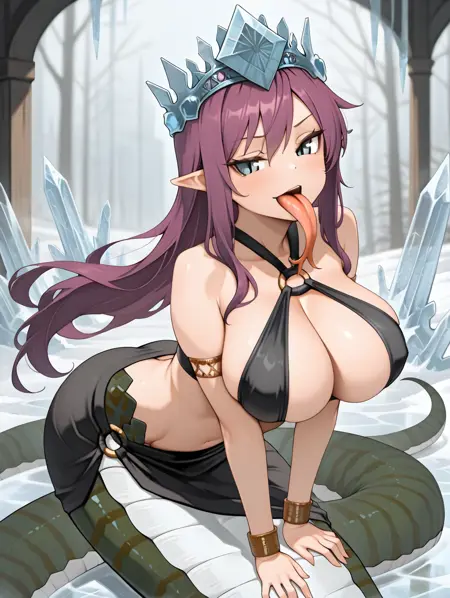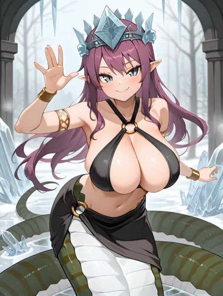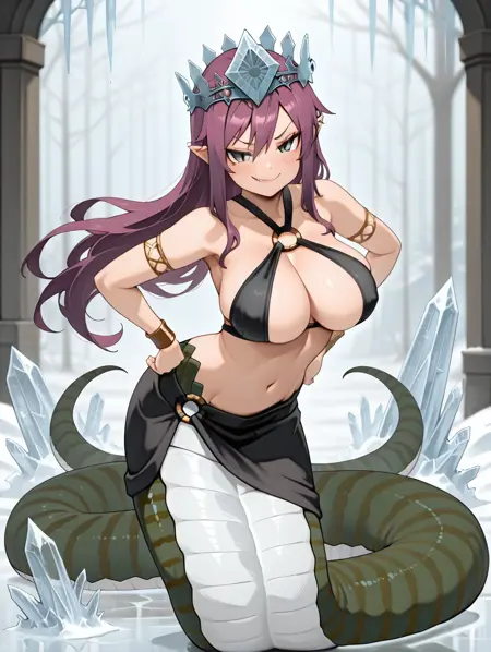 LmaAdtTey、紫髪、ロングヘア、青目、縦瞳、黒スカート、Oリング、黒Oリングトップ、ジュエリー、王冠、氷、凍結、尖った耳、ラミア、大人、大きな胸、