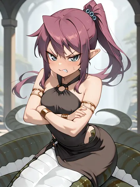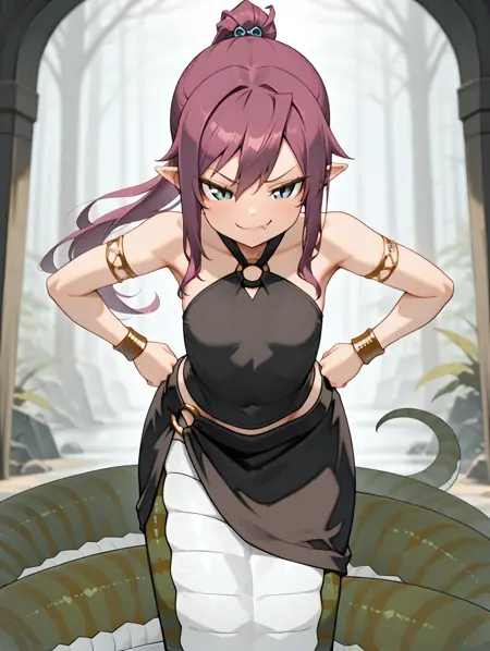 LmaTey、紫髪、ポニーテール、青目、縦瞳、黒スカート、Oリング、黒Oリングトップ、ジュエリー、尖った耳、ラミア、