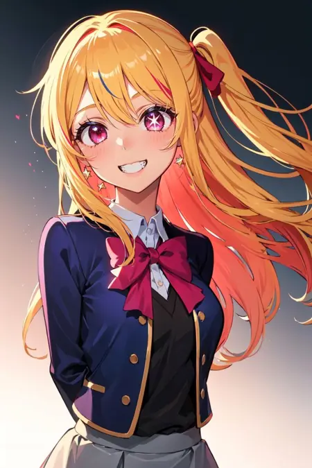 기본 시작 시 다음 태그를 사용하세요: pikkyruby, 1girl, solo, blonde hair, looking at viewer, long hair, sidelocks, smile, bangs, shirt, grey skirt, brown footwear, shoes, skirt, bow, jacket, white socks, socks, white shirt, long sleeves, red bow, school uniform, hair between eyes, blush, collared shirt, very long hair, open jacket, open clothes, kneehighs, pleated skirt, ponytail