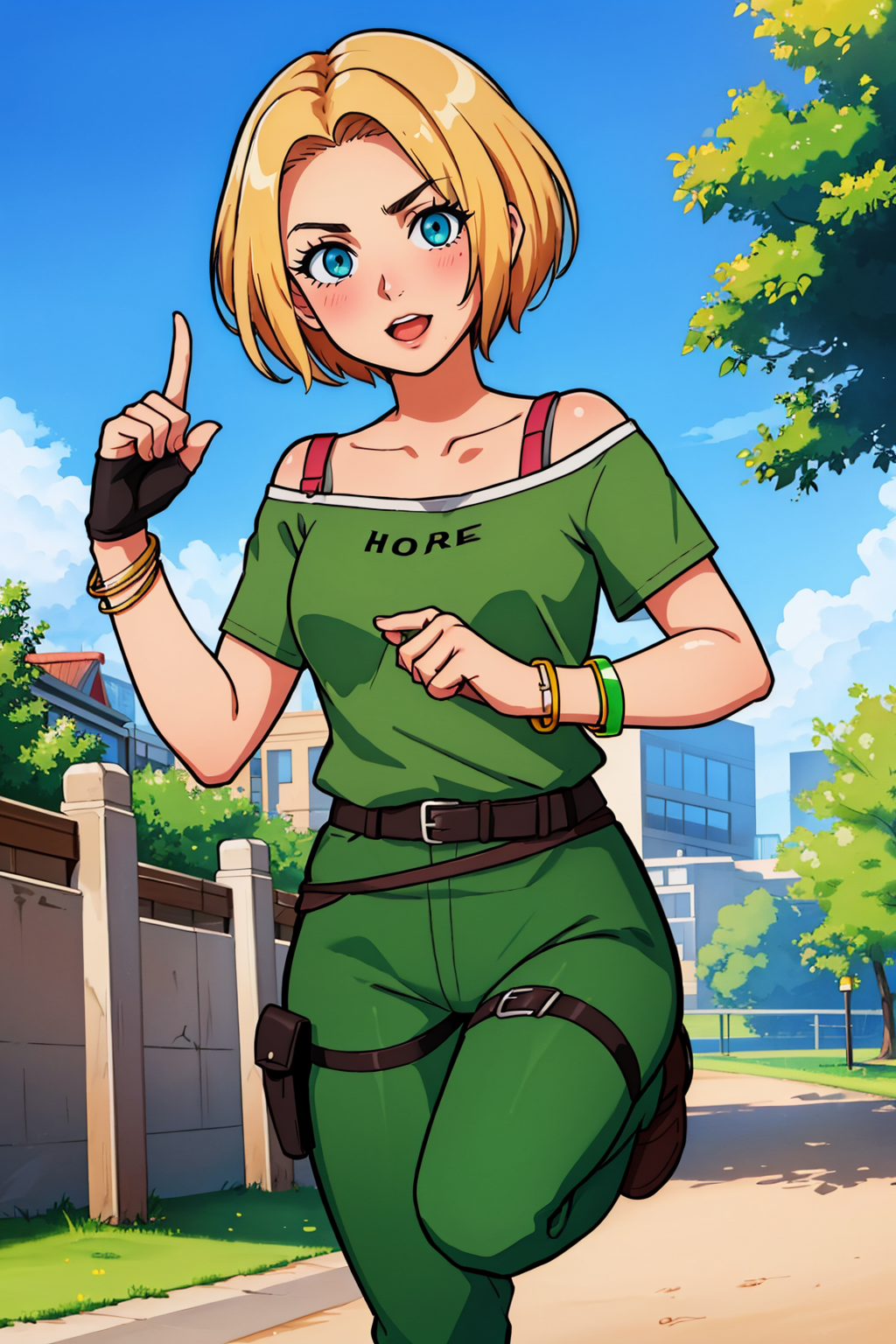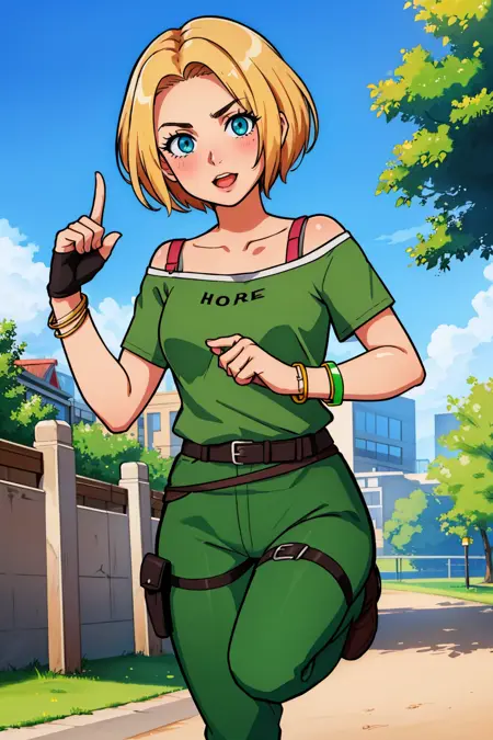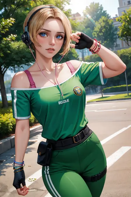 エリート衣装: ヘッドフォン、指なし手袋、ブレスレット、片肩出し、緑のシャツ、ブラストラップ、緑のパンツ、ベルト、ジムパンツ