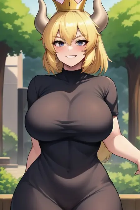 Bowsette is typically portrayed as a blonde woman with horns, fangs, a spiked collar with matching armbands and a black strapless dress