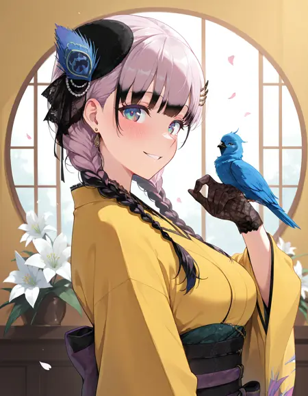 reinenewyear, 黄色和服, 日式服饰, 腰带, 袖带, 黑色手套, 双辫子