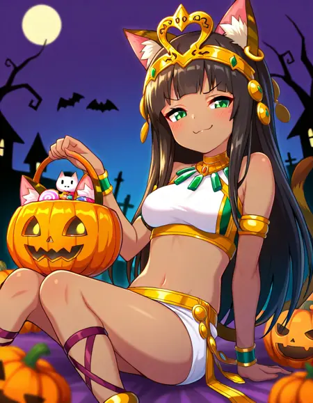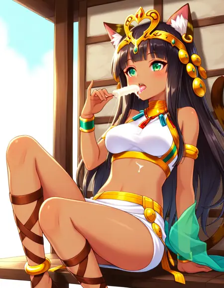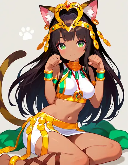 권장 프롬프트: 1girl, cat tail, cat ears, green eyes, dark skin, black hair, long hair, tiara, anklet, earrings, cross-laced footwear, skirt, armlet, tiara,
