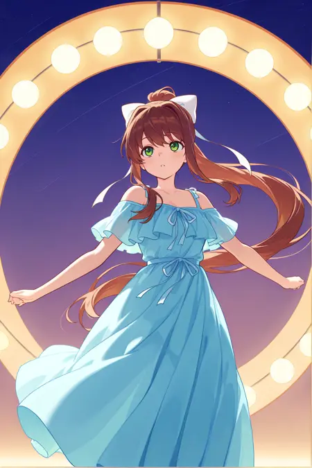 monika, long hair, brown hair, ponytail, green eyes, ribbon, white ribbon, bow, hair ribbon, hair bow, very long hair
