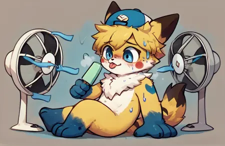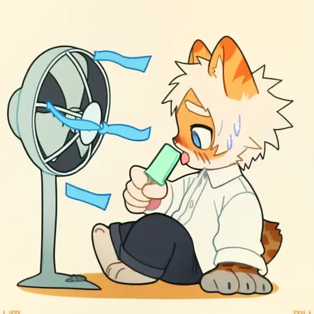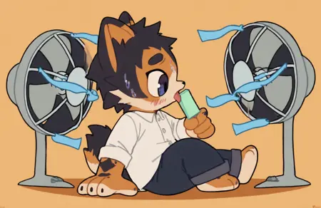mikus-concept, sitting pose, relaxed body, holding popsicle, licking popsicle, flushed face, sweat drops, hot weather, electric fan, blowing ribbons, summer theme, dynamic expressions, simple background, chibi