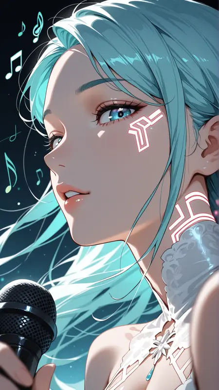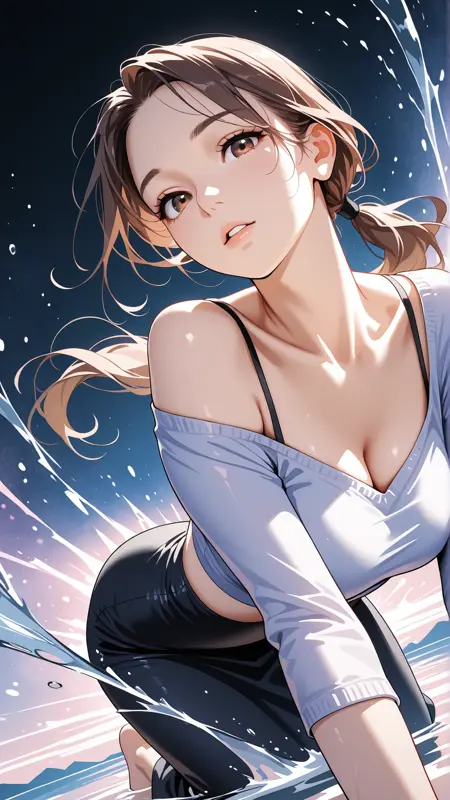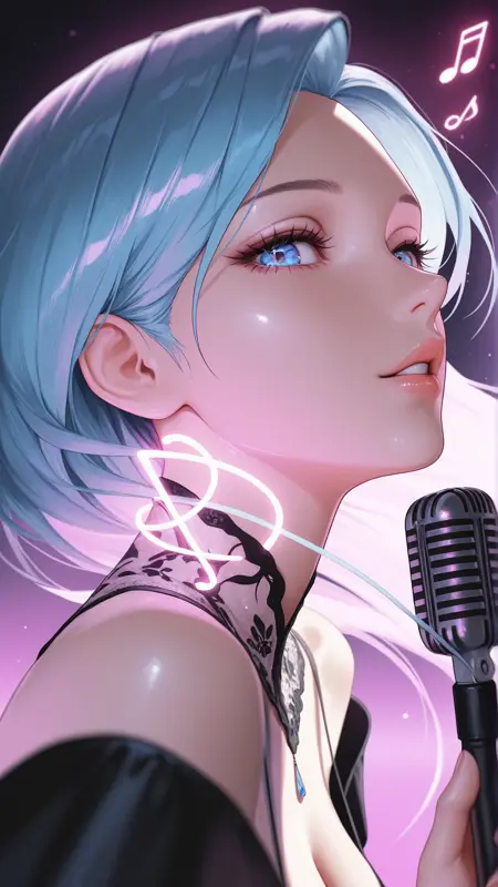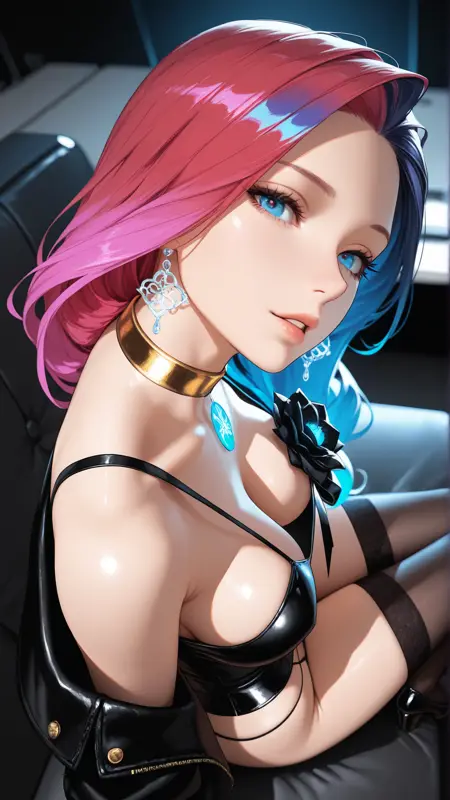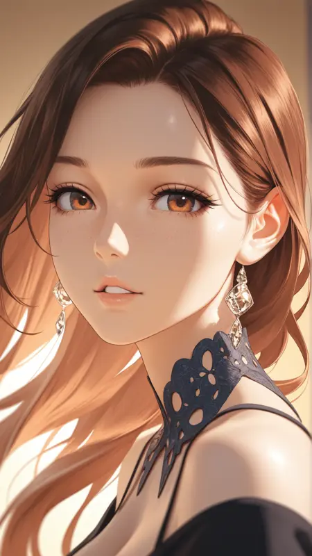 keeping a semirealistic look by spawning with hyperrealistic, near-photographic skin textures, a clean airbrush finish, and cinematic lighting. The look blends digital editorial aesthetics with anime-inspired elegance. Her clothing is form-flattering with textile-realistic sheen –